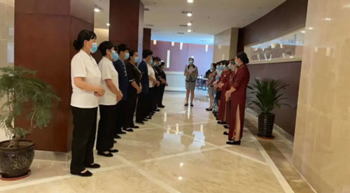 皇華酒店收到接待任務后,也立即研究接待方案,多部門配合前廳部迅速清理酒店大廳升級改造灰垢,客房部快速準備好客房,廚房部、餐飲部做好當晚及后續餐飲接待。