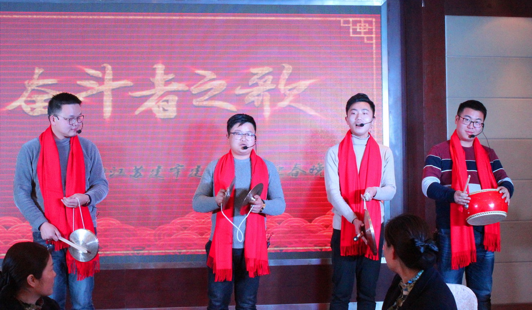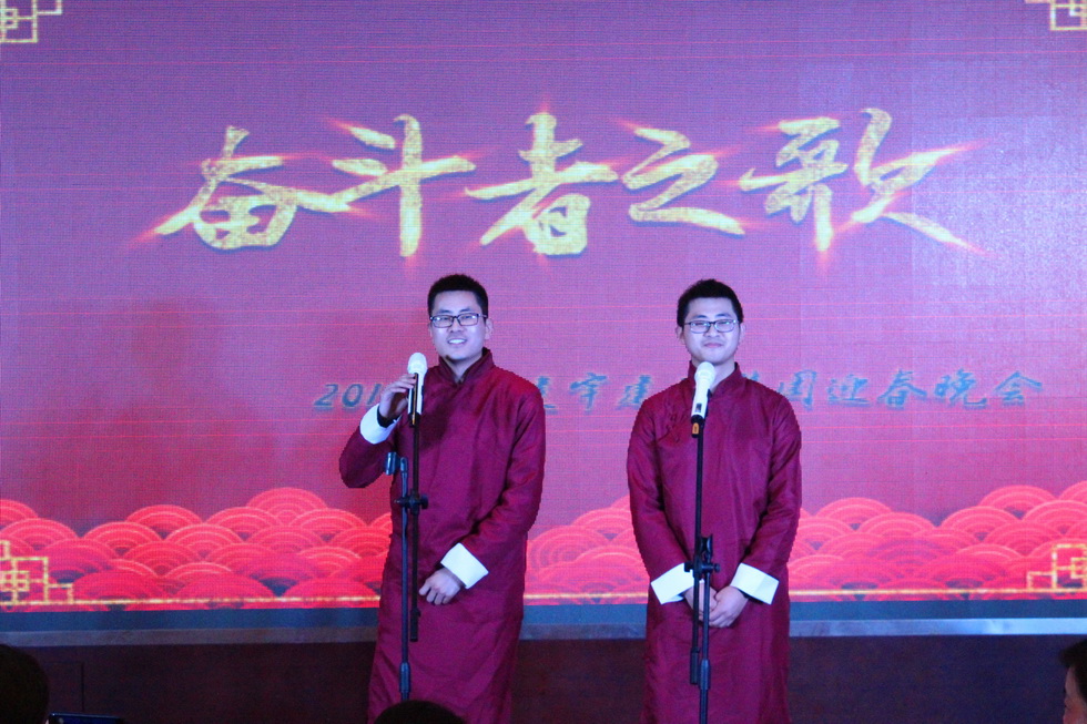 年會在董事長管民良“奮斗、團結”的致辭中開場,全體建宇人歡聚一堂,其樂融融。每個分公司、部門和集團皇華酒店都為年會精心準備了節目,展示大家工作能力以外的多才多藝,博得了陣陣掌聲,大家在歡聲笑語中分享成功,共敘友情。其中,工程部和財務部聯合表演的詩朗誦、市政公司的三句半、南京公司的相聲、皇華酒店的音樂快板才藝超群。最后集團公司的高層領導們一曲《眾人劃槳開大船》將年會推向了高潮。