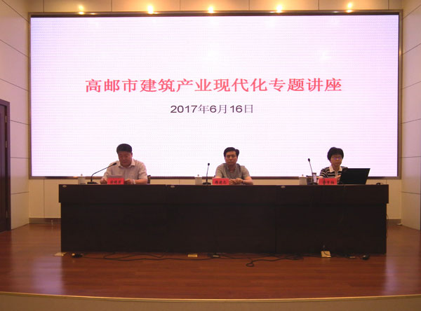 講座邀請了江蘇省建筑產業現代化推進辦公室韓建忠副主任和江蘇省住房和城鄉建設廳科技發展中心孫雪梅高級工程師分別作題為“江蘇省建筑產業現代化發展現狀與趨勢”和“江蘇省裝配式建筑預制裝配率計算細則”的講解。兩位專家就傳統建筑業現狀及問題闡述了建筑業目前面臨的困境,突出了企業尋求突破、轉型升級的重要性。同時講述了以新型建筑工業化生產方式為手段,以住宅產業現代化為重點,以“標準化設計、工廠化生產、裝配化施工、成品化裝修、信息化管理、智能化運營”為主要特征的高級產業形態及其實現過程。