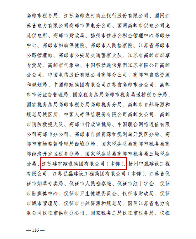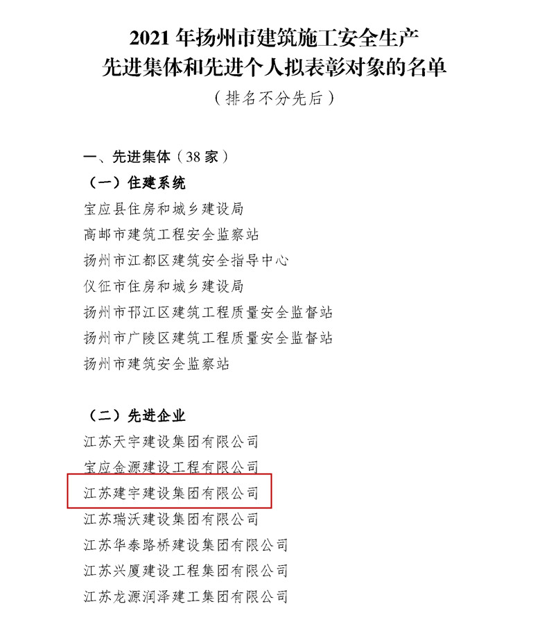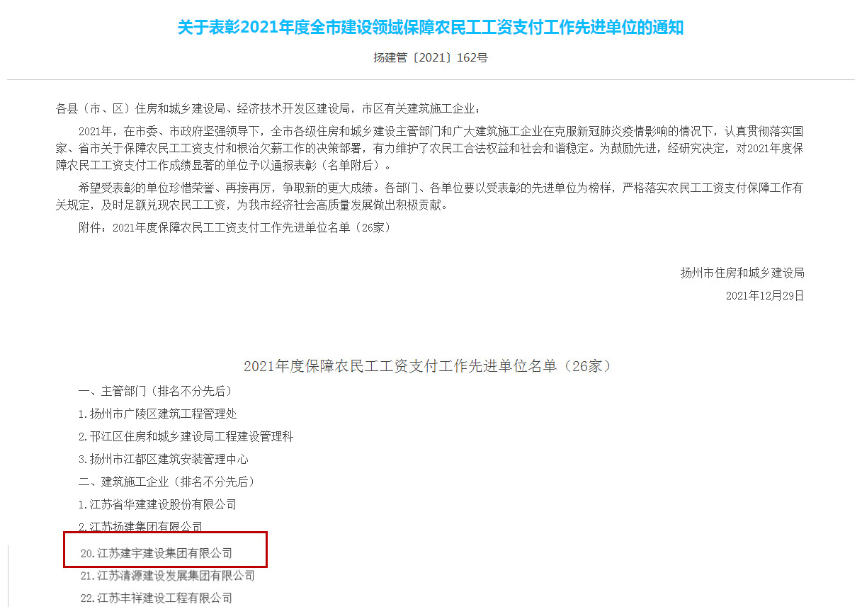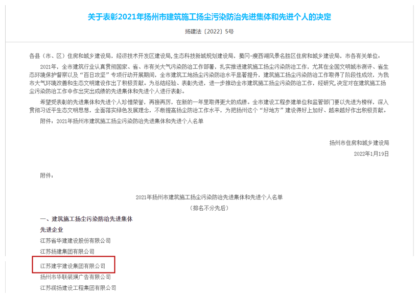 近日,集團被揚州市人民政府評為2021年度揚州市建筑業先進企業,這是集團第十一次獲此殊榮。同時集團被揚州市住房和城鄉建設局評為2021年度揚州市建筑施工安全生產先進集體、2021年度揚州市揚塵管理先進單位、2021年度揚州市建設領域保障農民工工資支付工作先進單位。此前,集團還被江蘇省精神文明建設指導委員會授予“2019-2021年度江蘇省文明單位”稱號。