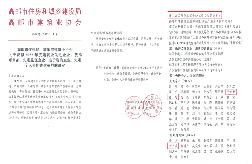 董事長管民良被授予“先進個人”稱號,集團南京分公司國際化名醫中心項目榮獲了“優秀項目部”,周月波同志榮獲“優秀建造師”,李維宏、陳超同志榮獲建筑業“先進個人”等多個獎項。