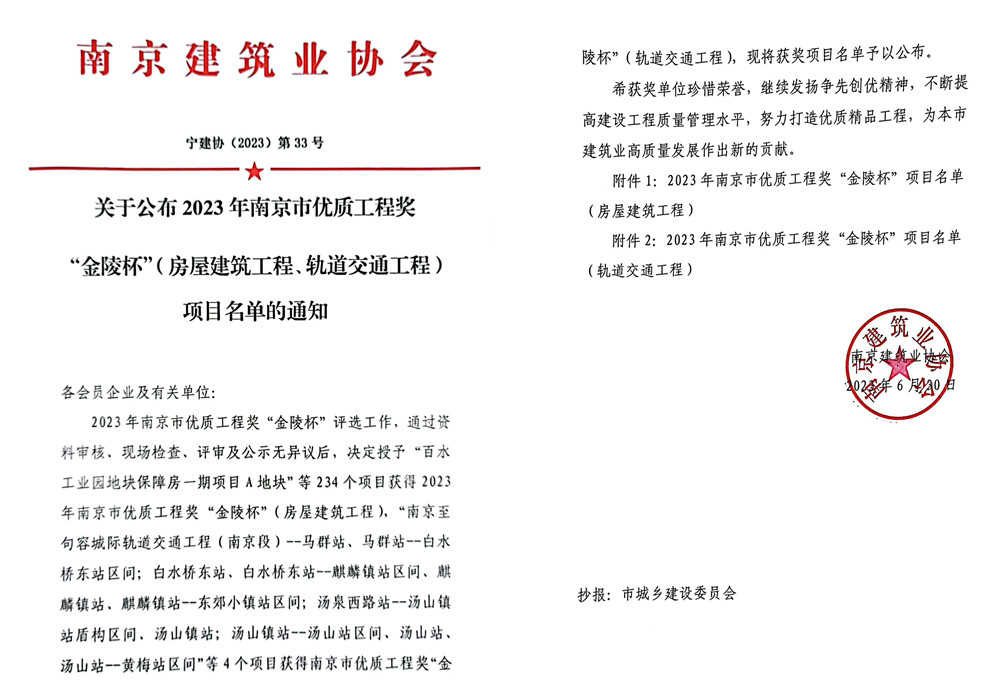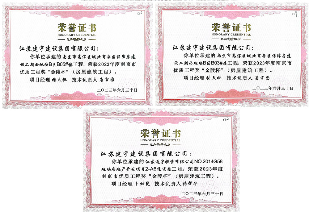 “金陵杯”是南京市建筑工程質(zhì)量領(lǐng)域的最高榮譽(yù),代表著全市范圍內(nèi)各建筑施工企業(yè)質(zhì)量管理的領(lǐng)先水平,評(píng)審標(biāo)準(zhǔn)高,數(shù)量控制嚴(yán)。南京分公司嚴(yán)抓管理,不畏強(qiáng)手,承建的高淳區(qū)城北商務(wù)區(qū)保障房建設(shè)二期西地塊B區(qū)B03#、B05#、江蘇通宇房地產(chǎn)開發(fā)項(xiàng)目2-A6住宅樓等三個(gè)項(xiàng)目榮獲2023年南京市優(yōu)質(zhì)工程獎(jiǎng)“金陵杯”。