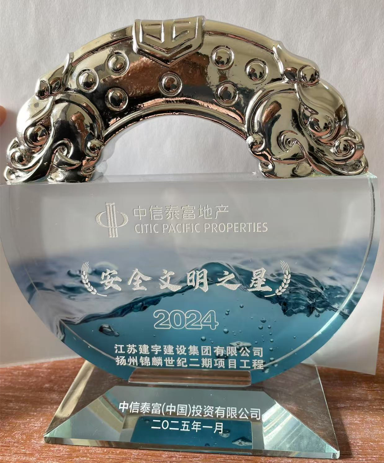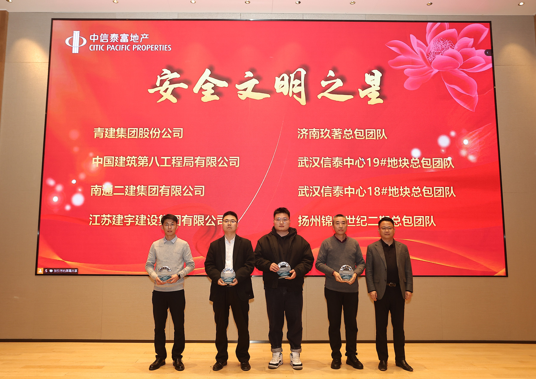會上,集團憑借在安全文明施工管理方面的卓越表現,從眾多優秀的供應商中脫穎而出,榮獲了中信泰富地產年度安全管理類的最高獎項——“2024年度安全文明之星”獎。僅有四家總包單位獲此殊榮,這一榮譽是對集團長期以來堅持精細管理、尤其是對揚州錦麟世紀二期項目部狠抓安全管理的充分肯定。