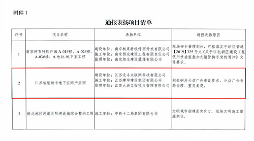 地下空間產(chǎn)業(yè)園項(xiàng)目因安全管理、文明施工到位,文明城市創(chuàng)建落實(shí)有力,獲得了南京江北新區(qū)建交局質(zhì)安站的通報(bào)表?yè)P(yáng)。項(xiàng)目部積極響應(yīng)公益廣告布置要求,公益廣告布局合理、整齊美觀受到主管部門(mén)領(lǐng)導(dǎo)的一致好評(píng),成為江北新區(qū)建筑工地安全文明建設(shè)的領(lǐng)頭羊。