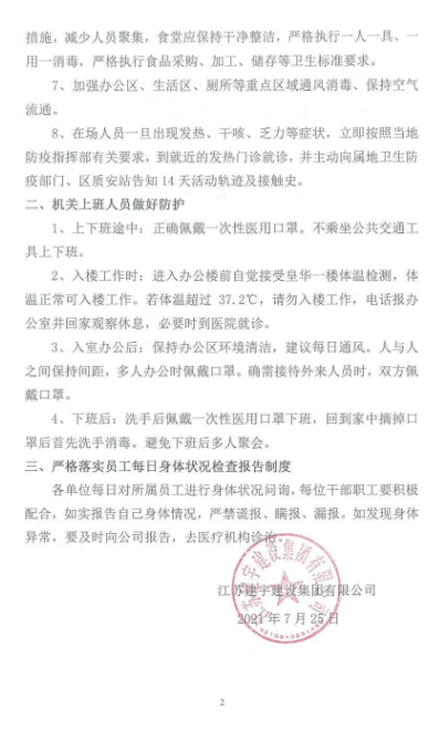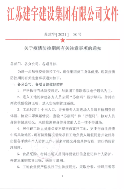 各部門和分公司迅速召開疫情防控專題會議,傳達集團疫情防控要求,對防控工作作出安排。尤其是身處疫情中心的南京和揚州分公司各項目部,自疫情爆發后,各項目部堅決執行當地疫情防控規定。